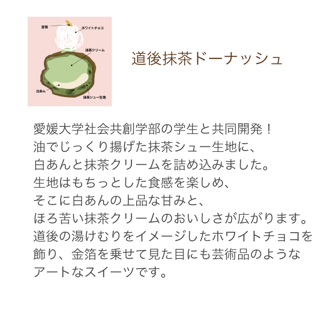 一六本舗 道後本館前店の店内にガラス張りの工房を併設しています。「一六タルトの天ぷら」や「道後どらバーガー(あんバター)」など、お客様に作りたてのおいしさをお届けいたします。道後散策の食べ歩きスイーツとして楽しい思い出と共にご賞味ください。