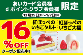 あいカード会員様・dポイントクラブ会員様限定 紅ほっぺのいちご大福・紅ほっぺのいちごタルト16%OFFクーポン配布中!