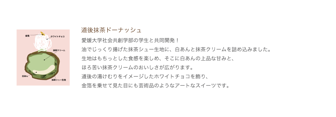 一六本舗 道後本館前店の店内にガラス張りの工房を併設しています。「一六タルトの天ぷら」や「道後どらバーガー(あんバター)」など、お客様に作りたてのおいしさをお届けいたします。道後散策の食べ歩きスイーツとして楽しい思い出と共にご賞味ください。