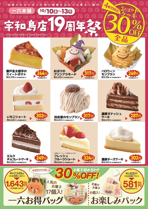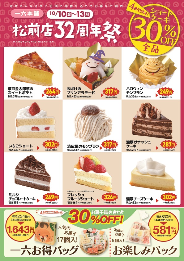 ショートケーキ全品30%OFFや、一六お得バッグ・お楽しみパックの販売など、大変お買い得です。