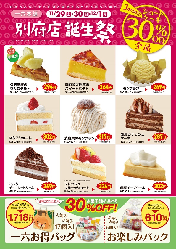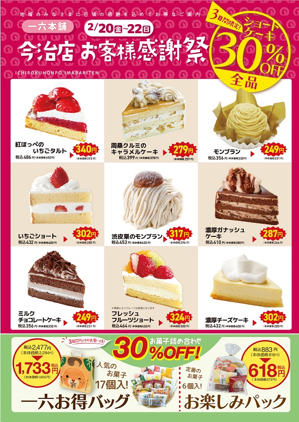 ショートケーキ全品30%OFFや、一六お得バッグ・お楽しみパックの販売など、大変お買い得です。 ぜひ皆さまのご来店を心よりお待ちしております。 一六本舗は地域一番店を目指し、これからもおいしいお菓子をお届けして参ります。
