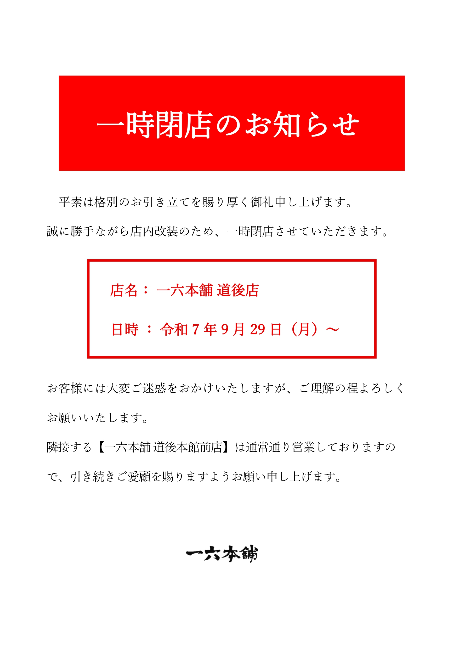一六本舗 道後店 一時閉店のお知らせ
