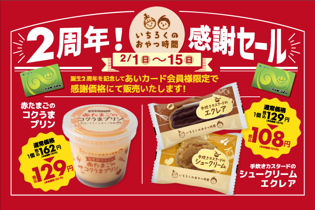 2周年を記念して「手炊きカスタードのシュークリーム・エクレア」「赤たまごのコクうまプリン」を あいカード会員様限定で感謝価格にて販売いたします!