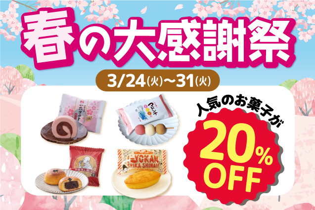 3月24日(火)~3月31日(火)の期間、一六本舗人気のお菓子を20%OFFの感謝価格で販売いたします。