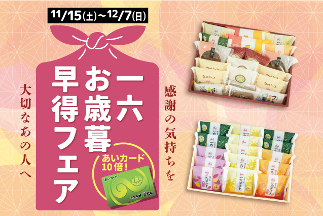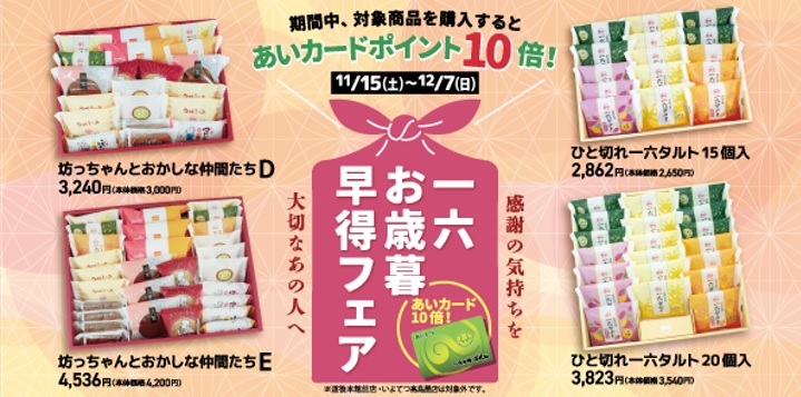 ご家族やご親戚、ご友人へ一年の感謝の気持ちを込めたお歳暮を贈りませんか。 一六本舗では11月15日(土)~12月7日(日)の期間中下記の対象商品を購入すると、 あいカードポイント10倍プレゼント! 大変お得なこの機会にぜひ一六本舗をご利用ください。 ※詰合せ内容は変更する場合がございます。