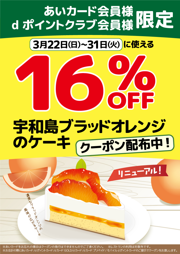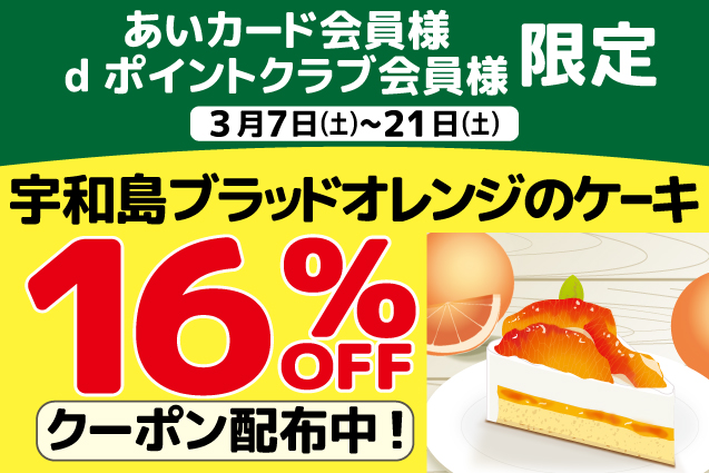 あいカード会員様・dポイントクラブ会員様限定 宇和島ブラッドオレンジのケーキ16%OFFクーポン配布中!