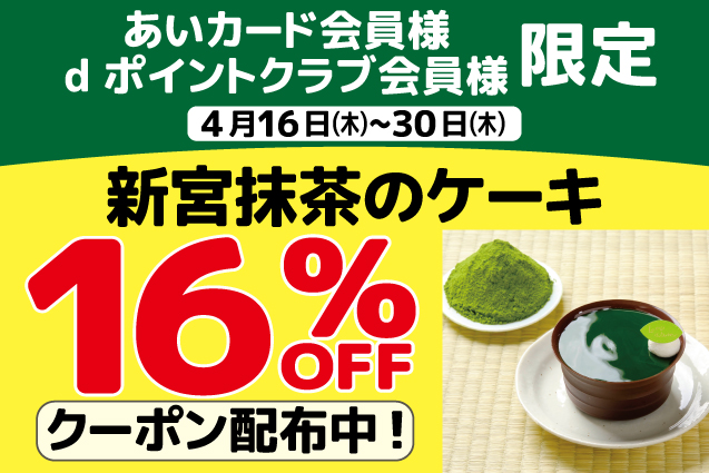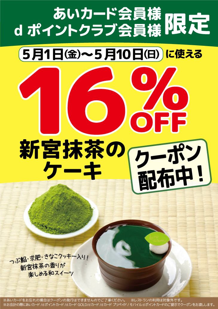 あいカード会員様・dポイントクラブ会員様限定 新宮抹茶のケーキ16%OFFクーポン配布中!