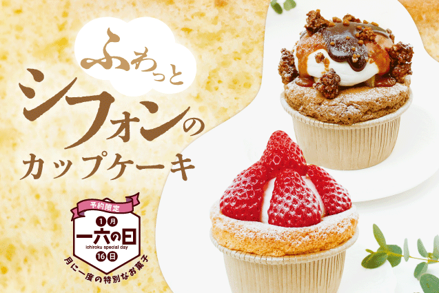 1月のお菓子は『ふわっとシフォンのカップケーキ』 ふんわりやわらかな、こだわり食感のシフォンケーキです。 2種類の味わいをご用意しました。 ご予約限定商品です。お近くの一六本舗までお気軽にお問い合わせください。