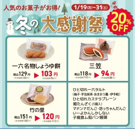 1月19日(月)~1月31日(土)の期間、一六本舗人気のお菓子を20%OFFの感謝価格で販売いたします。