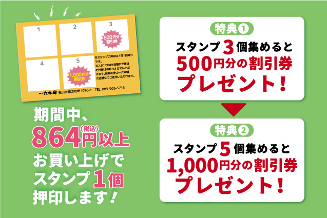 スタンプが3個貯まると一六本舗で使用できる500円分の割引券をプレゼント。