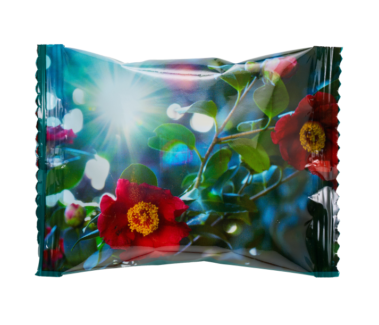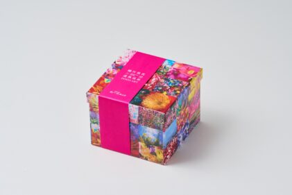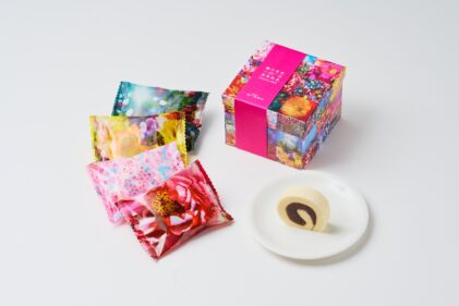 「ひと切れ一六タルト 柚子」のパッケージを、「蜷川実花 with EiM × 道後温泉 DOGO ART」にちなんだ4種類の美しいアートデザインで装い、さらにこの4種類を1箱に詰め合わせました。