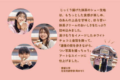 道後の湯けむりをイメージしたホワイトチョコを飾り、金箔を乗せて