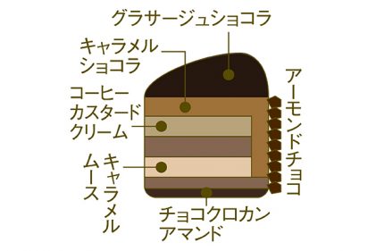 ココアスポンジを使用したショコラケーキ。 底にはチョコクロカンアマンド、中にはコーヒーカスタードクリームとキャラメルムース! 香り高く、風味豊かな美味しさです。 直径:15cm(4~6人用)、高さ:5cm
